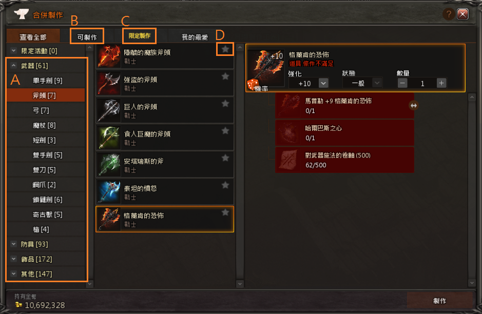 B.可製作:只會顯示材料足夠且可以製作的項目