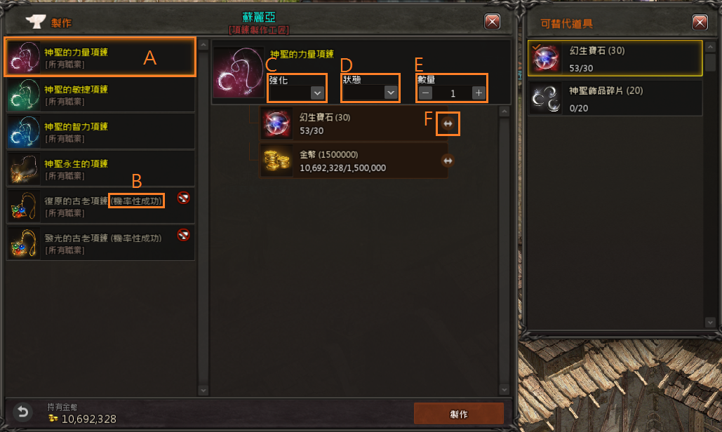 E.數量:可選擇需要製作的數量,如無法選擇數量代表該道具每次只能製作1個