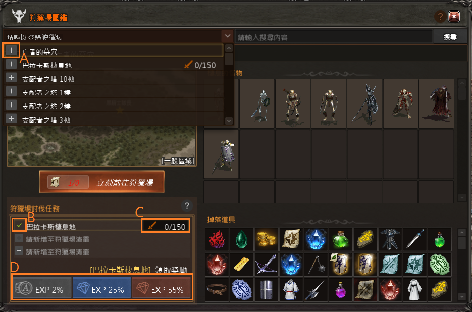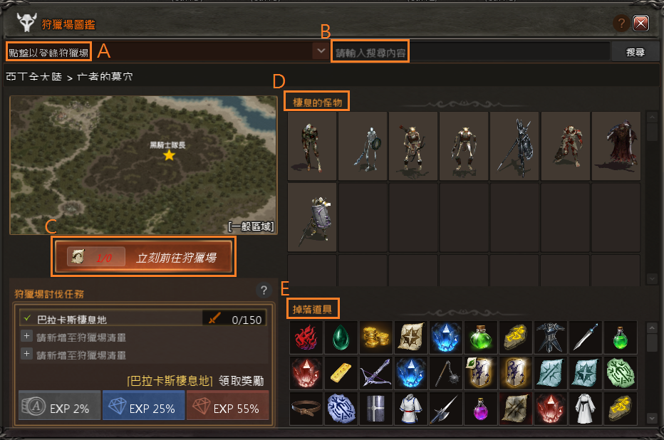 E.顯示該地圖會掉落的道具,也可直接點選怪物顯示怪物的掉落。