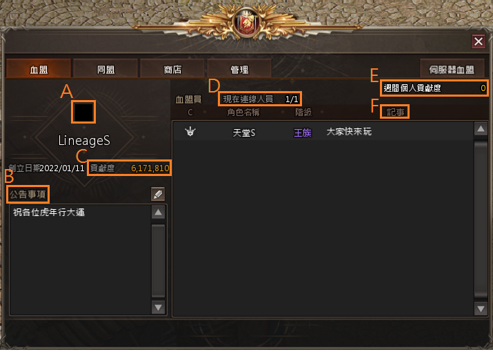 D.現在連線人員:顯示目前血盟在線人數,血盟人數上限為50