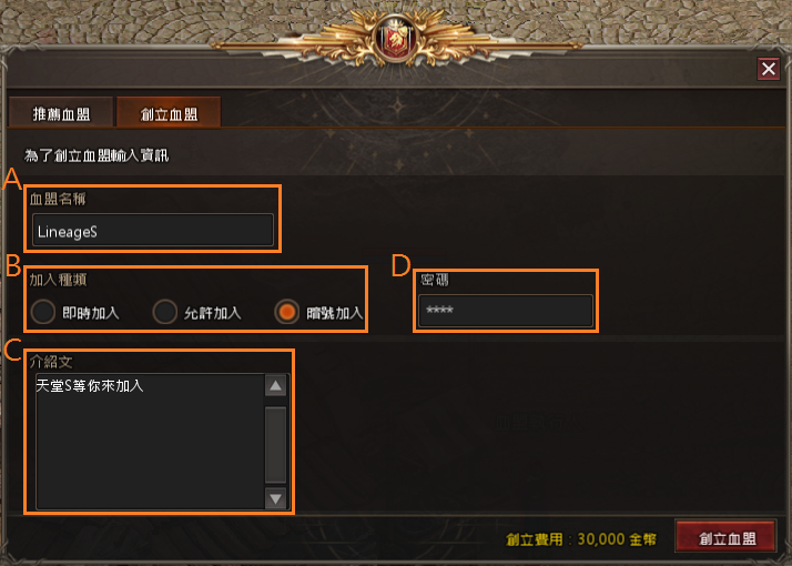 A.血盟名稱:輸入英數或中文,最多16個字元