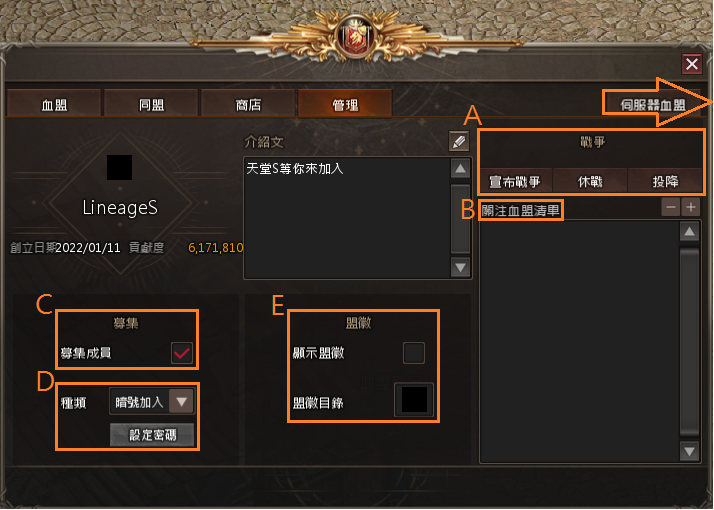 C.募集:開啟募集成員後,可以在伺服器血盟看見血盟的資訊