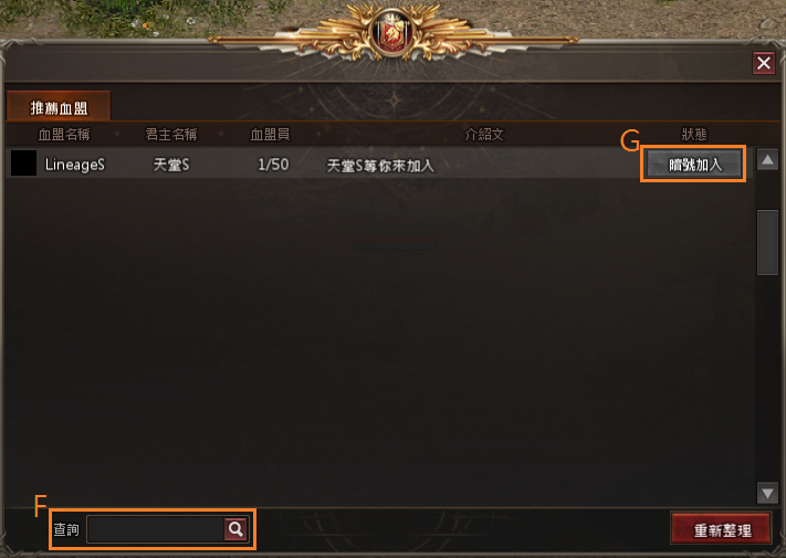 G.狀態:顯示各血盟的加入種類,點選後即可加入血盟