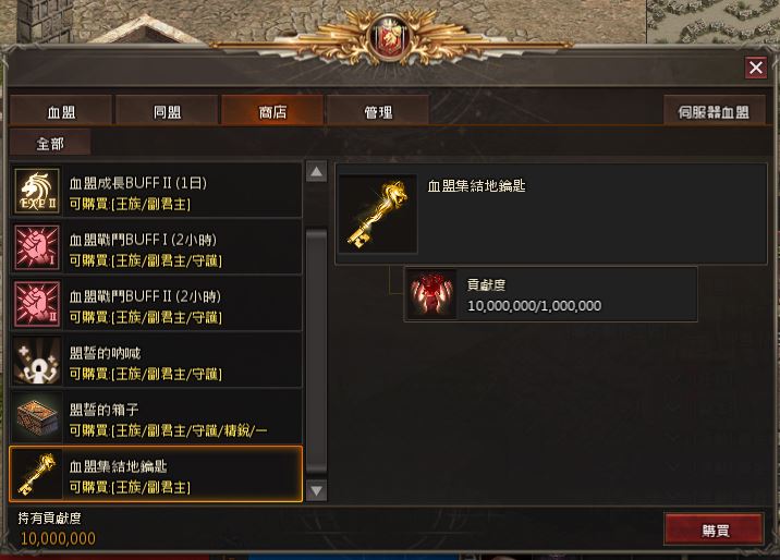 1.血盟盟主可透過ctrl+C血盟商店UI使用血盟貢獻度購買血盟集結地鑰匙,購買血盟集結地鑰匙所需的血盟貢獻度為300萬
